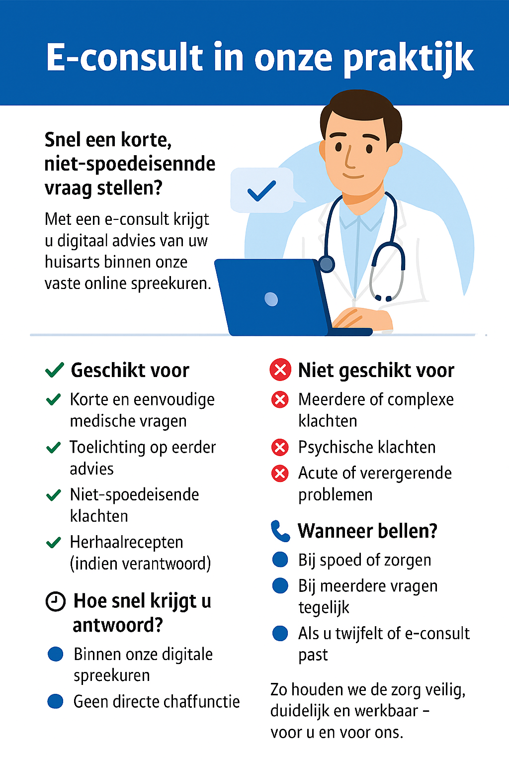 Een e‑consult is een handige manier om korte, niet‑spoedeisende vragen aan ons te stellen. Het helpt u snel duidelijkheid te krijgen, en het helpt ons om de zorg overzichtelijk en veilig te houden. Op deze pagina leest u precies wanneer een e‑consult geschikt is, hoe snel u antwoord kunt verwachten en wanneer bellen of langskomen.